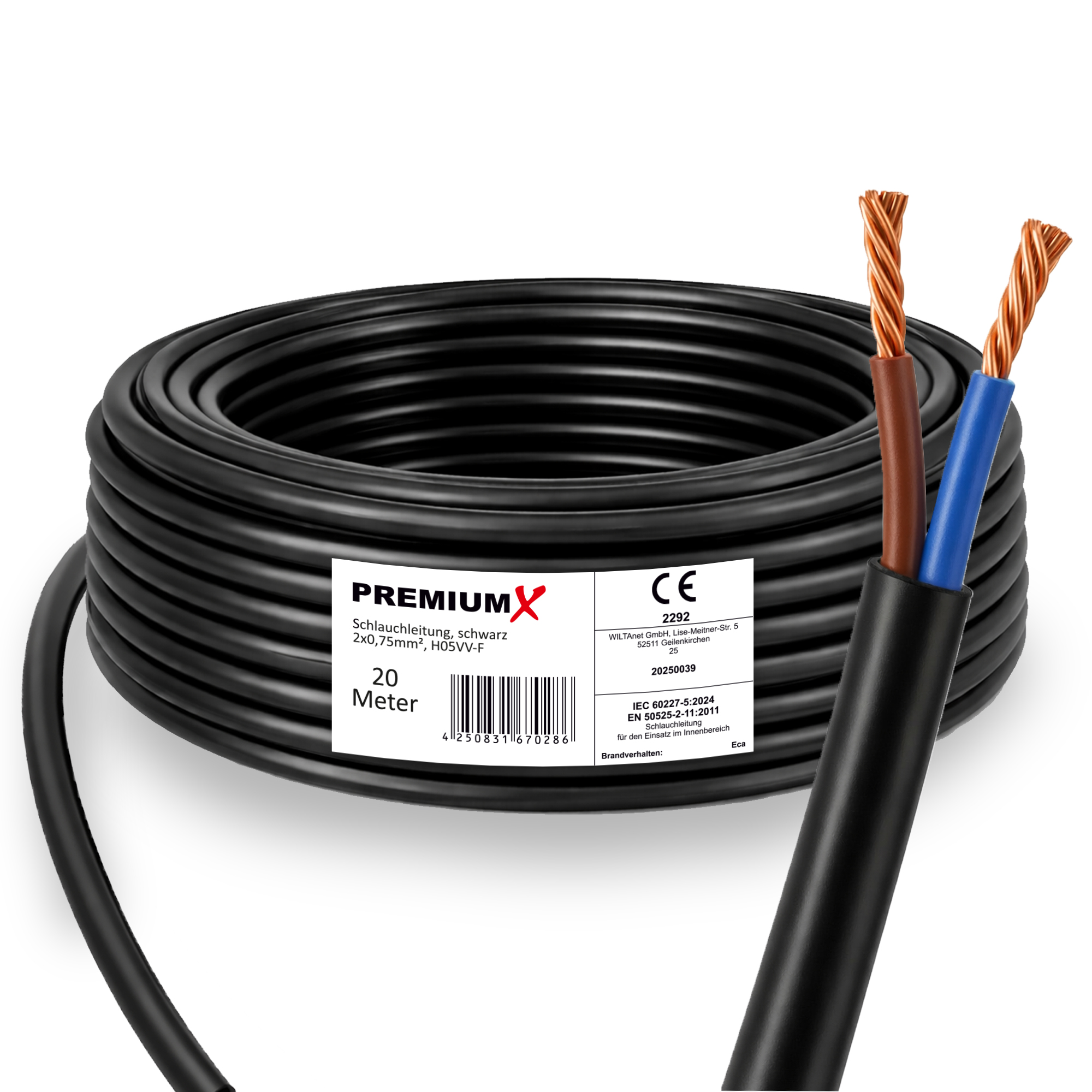 PremiumX Schlauchleitung H05VV-F 2x0,75 mm² 20 Meter flexible Anschlussleitung PVC