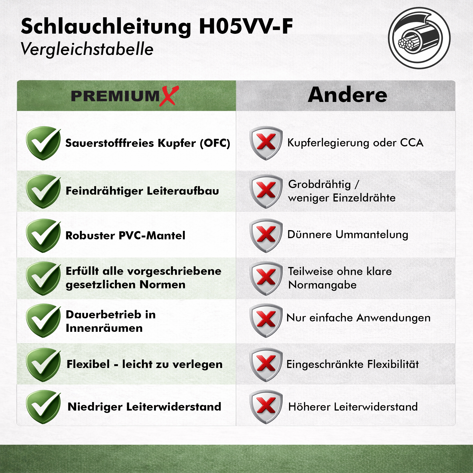 Die PremiumX Schlauchleitung H05VV-F 2×0,75 mm² ist eine flexible PVC-Mantelleitung für den Einsatz in trockenen Innenräumen. Sie eignet sich ideal für leichte Haushaltsgeräte, Lampen, Leuchten, Verlängerungen und Kleinverbraucher mit geringer mechanischer Beanspruchung.