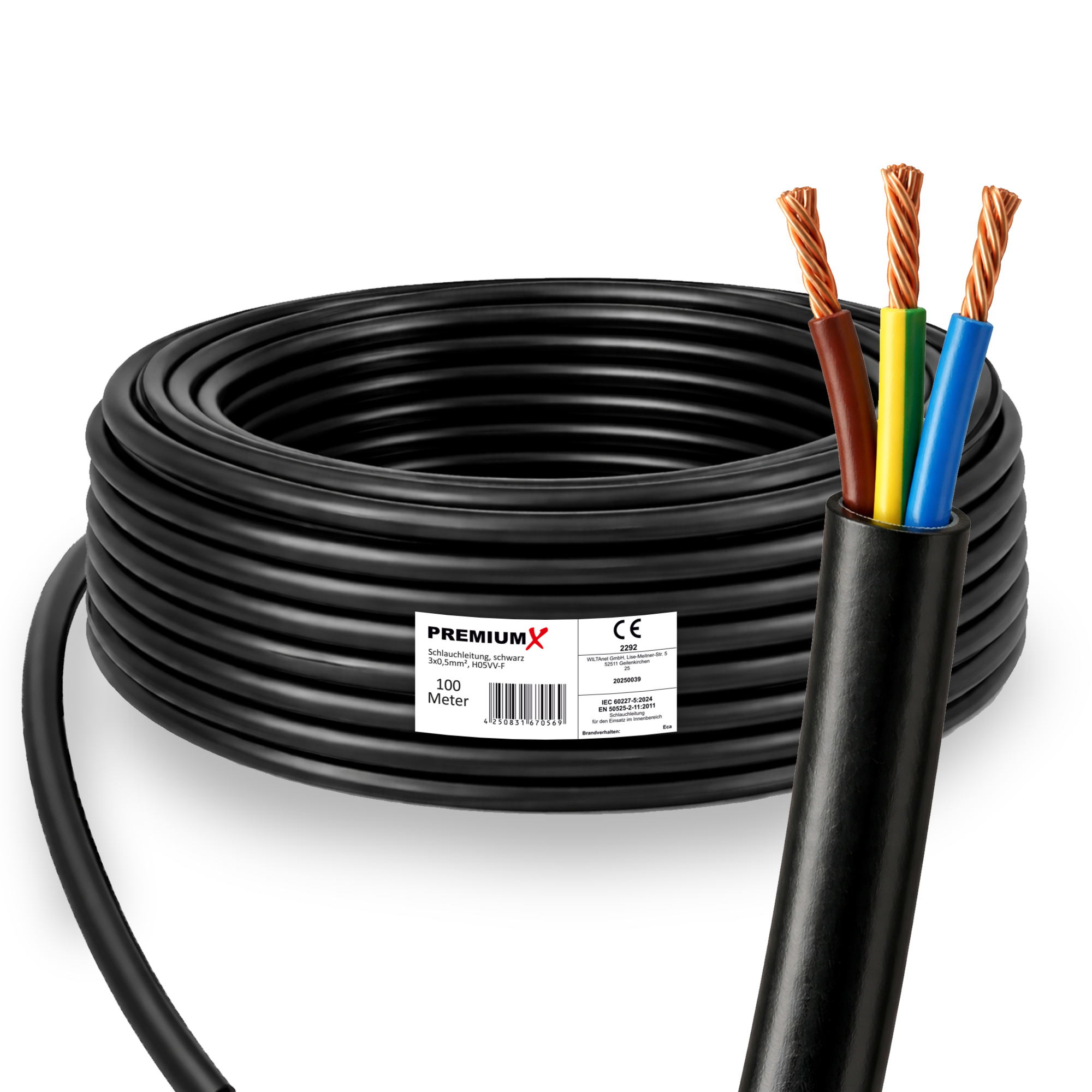 PremiumX Schlauchleitung H05VV-F 3x0,5 mm² 100 Meter flexible Anschlussleitung PVC