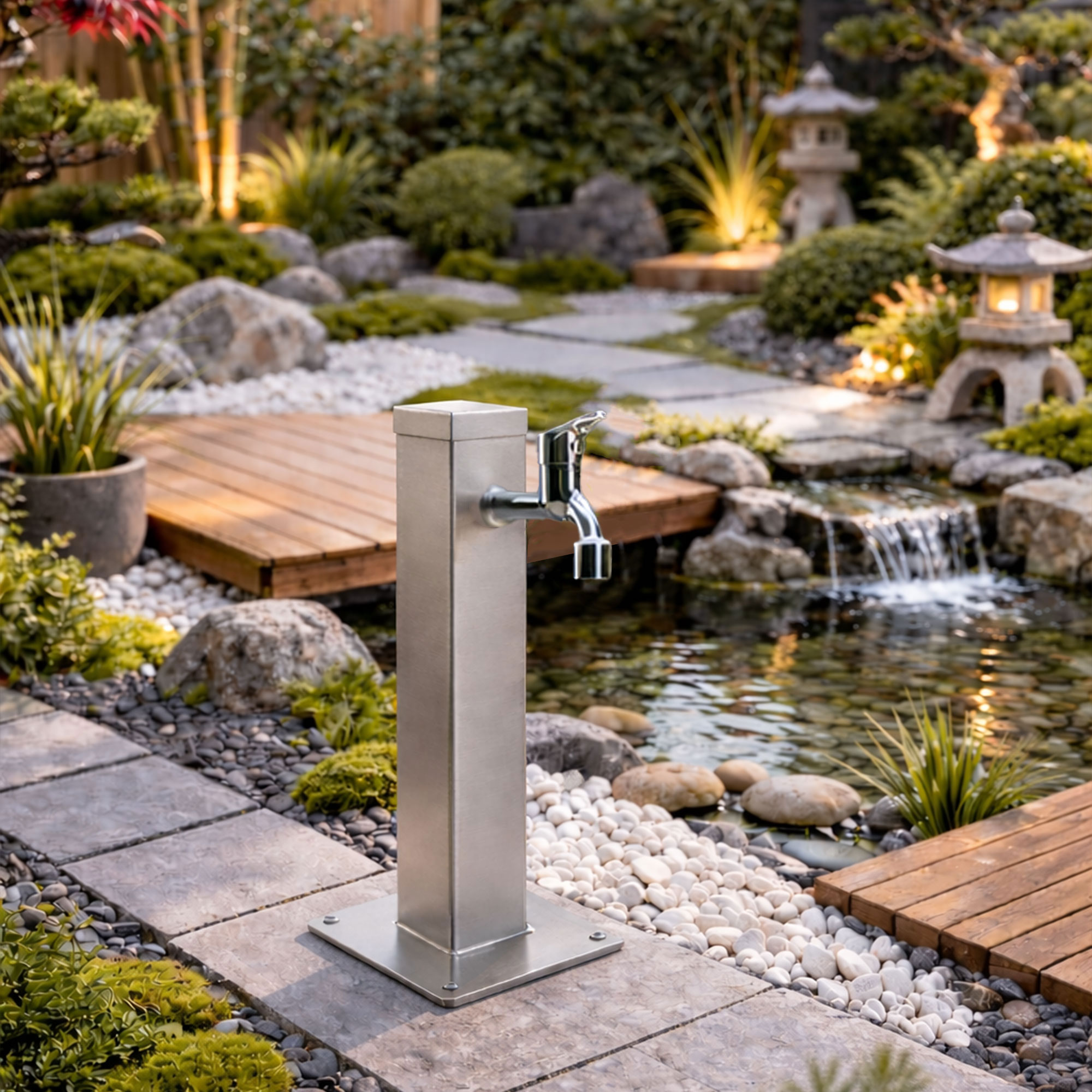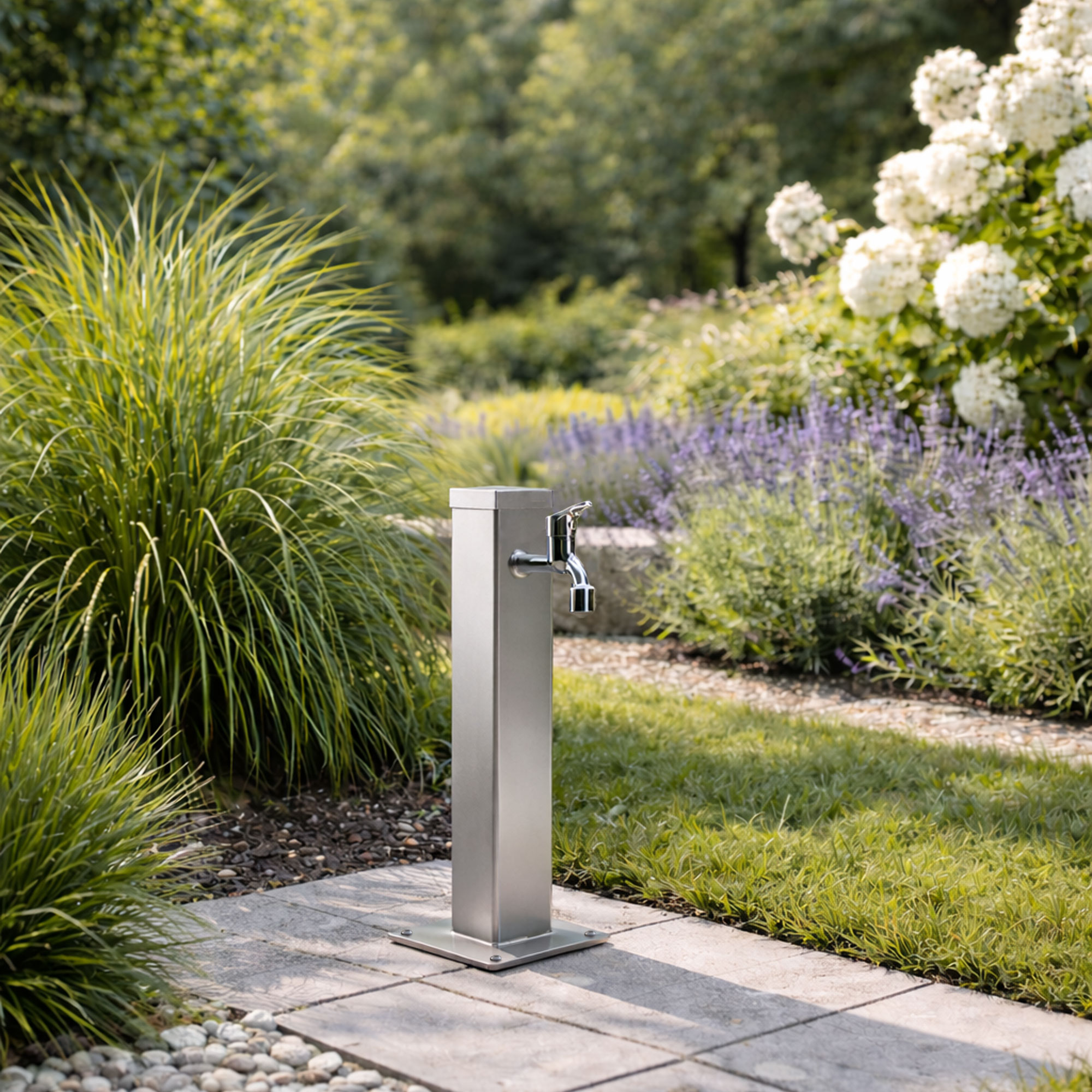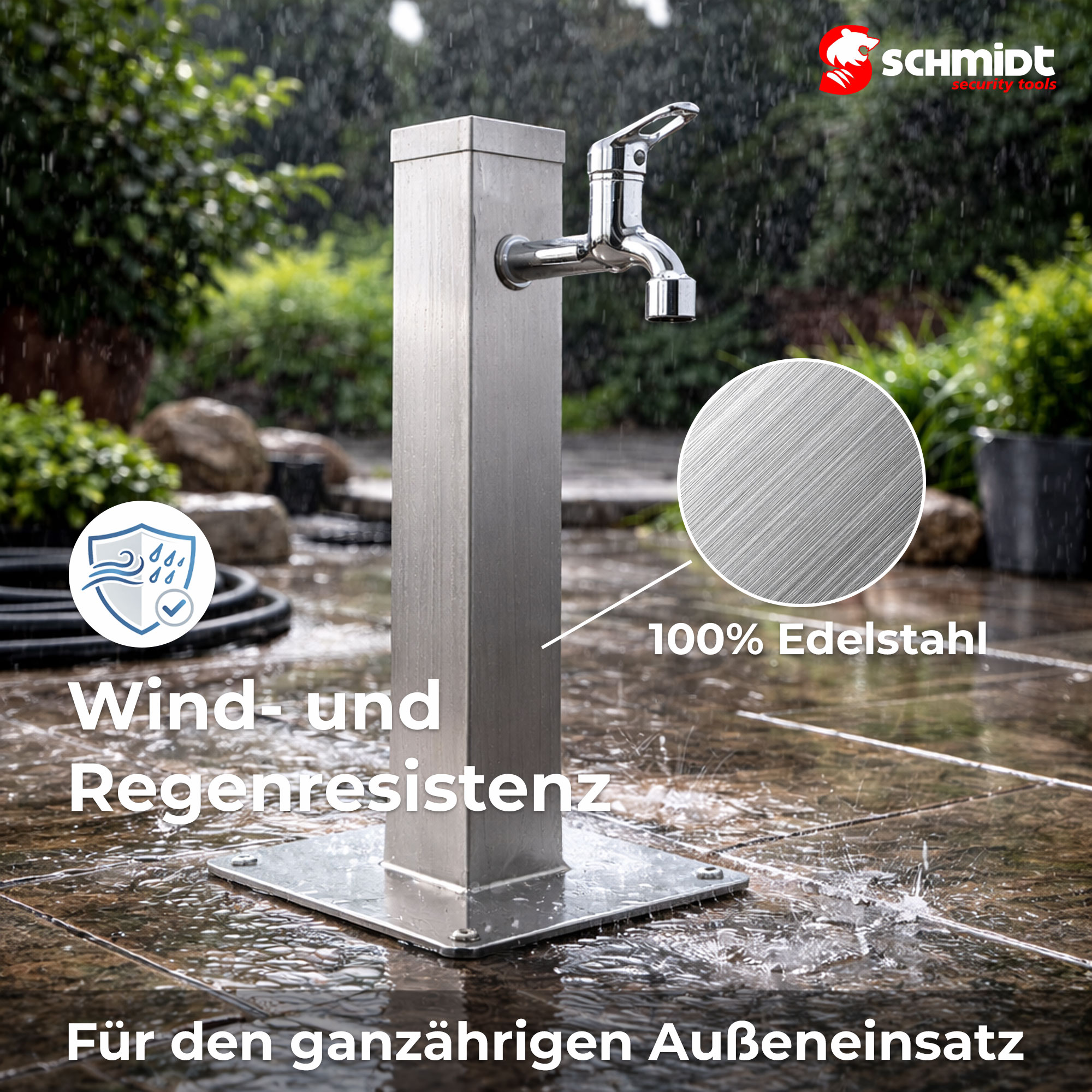 Dank rostgeschütztem Edelstahl ist die Wassersäule wind- und regenresistent und somit perfekt für den ganzjährigen Einsatz im Garten, auf der Terrasse oder in der Einfahrt geeignet.