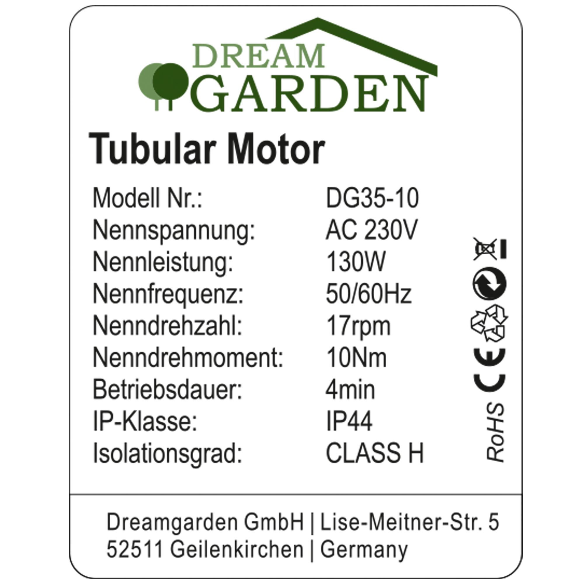 Dreamgarden Rohrmotor DG 35-10 Markise Motor mit Funkempfänger und Fernbedienung