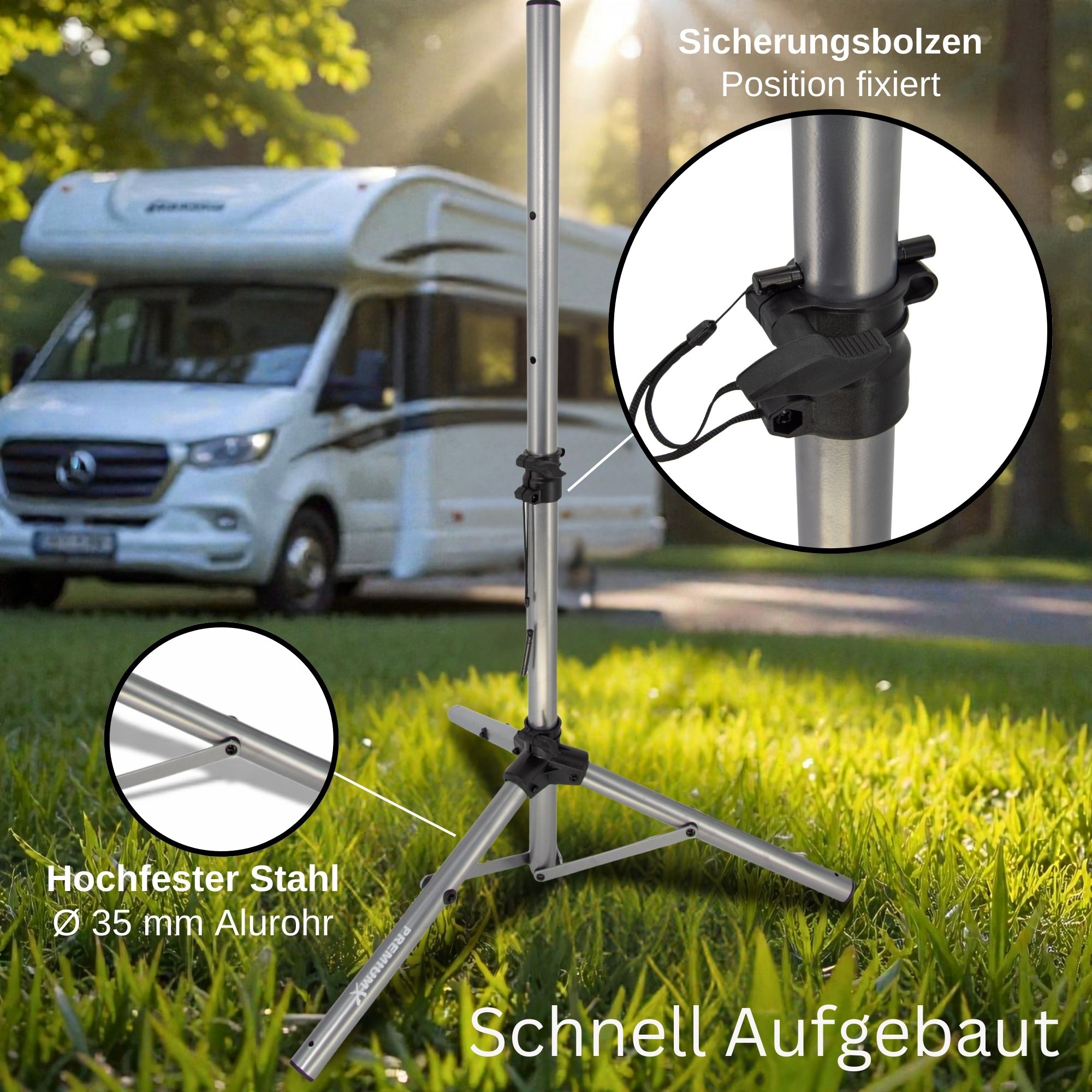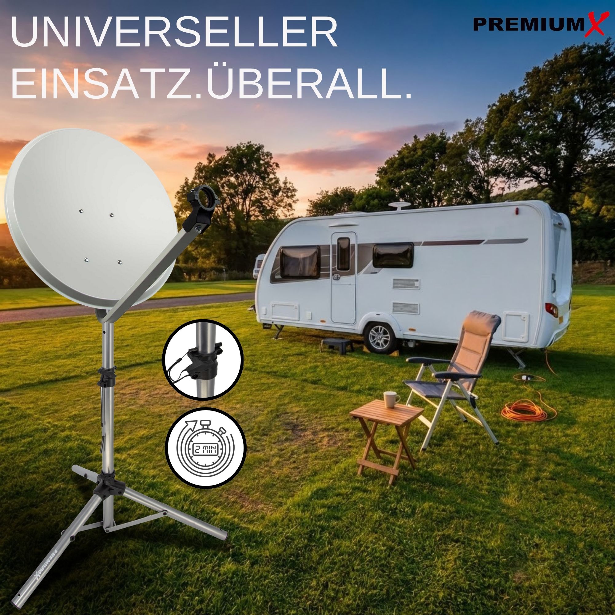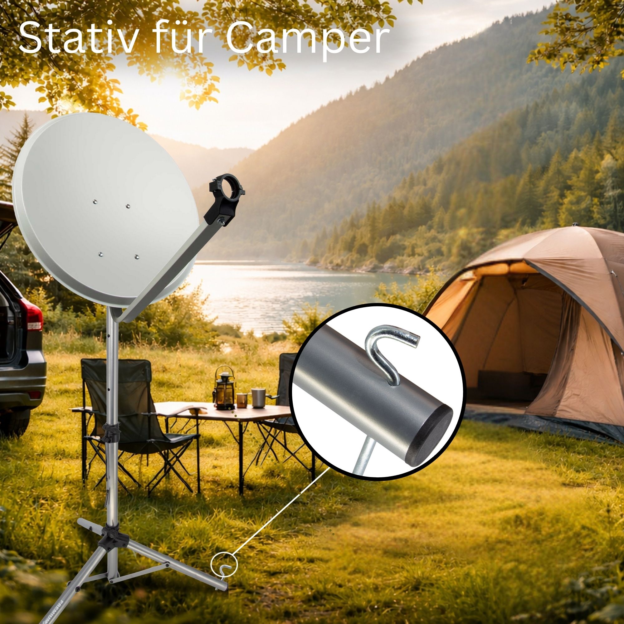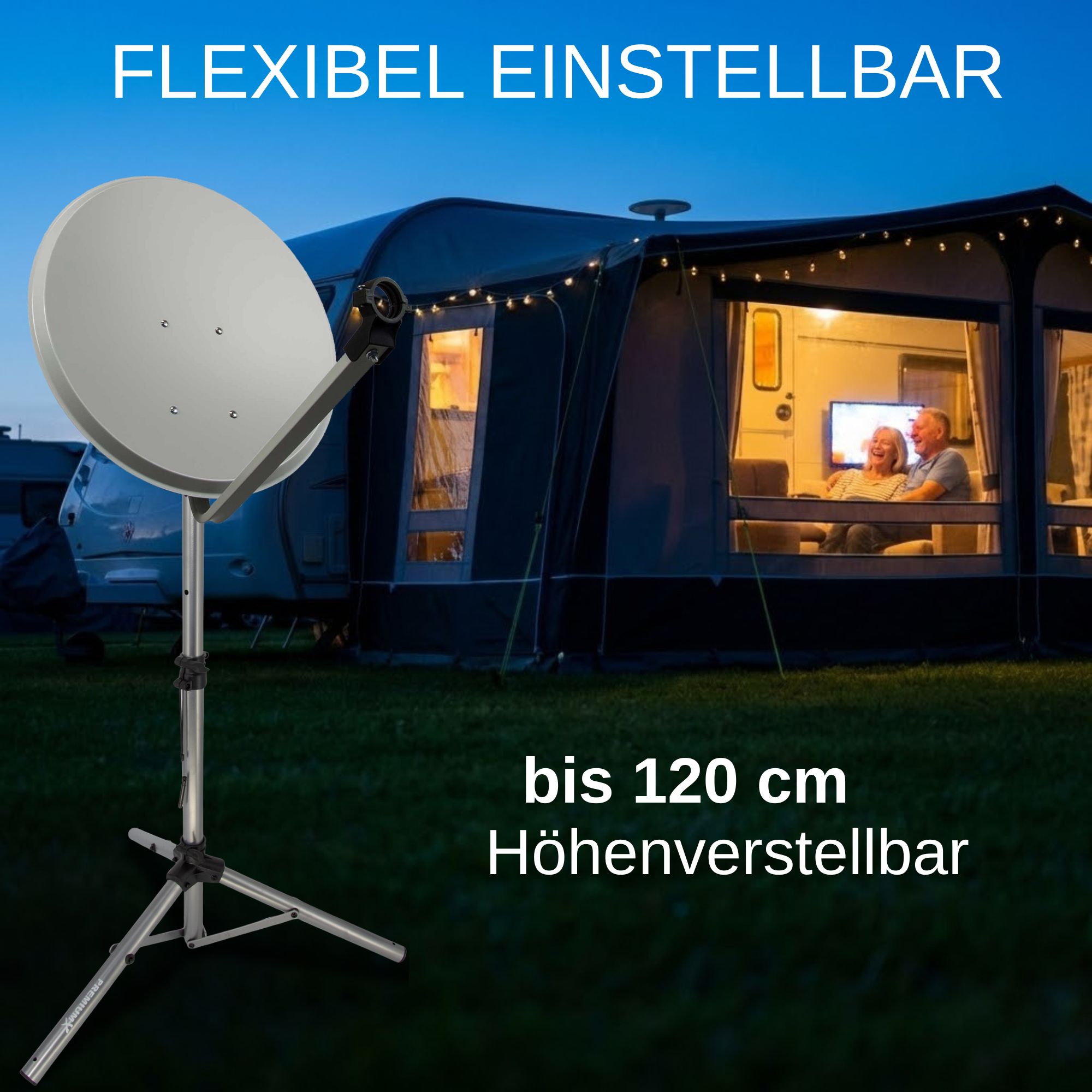 Schnappen Sie sich das PremiumX Dreibein und legen Sie los. Die Montage ist kinderleicht: Einfach aufklappen, mit den Alu-Heringen fixieren und loslegen. Das neue Modell ist dank Teleskopstange bis auf 120 cm höhenverstellbar und bietet Sat-Antennen bis 85 cm einen sicheren Halt. Kompakt zusammenklappbar und extrem stabil – das Must-have für jeden Camping-Fan!