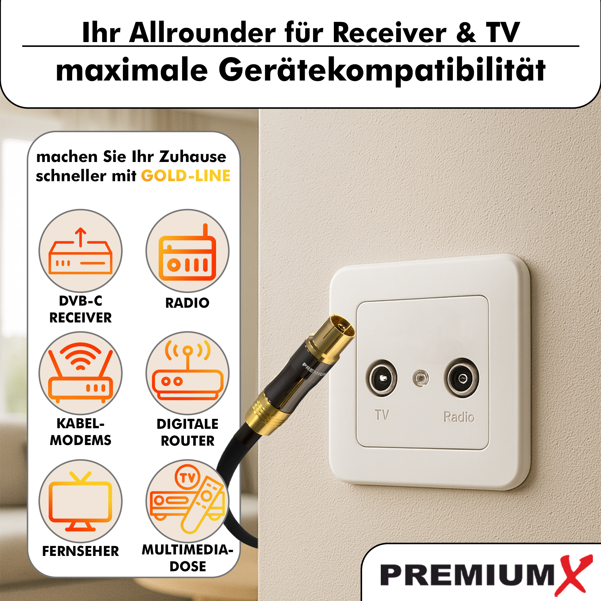 Das PremiumX GOLD-LINE Koaxialkabel ist die ideale Verbindung zwischen Antennendose und TV-Gerät oder Receiver. Mit einem hochwertigen IEC-Stecker auf IEC-Kupplung sorgt es für zuverlässige Signalübertragung – perfekt geeignet für digitales Fernsehen in HD, Full HD, UHD und 8K.
