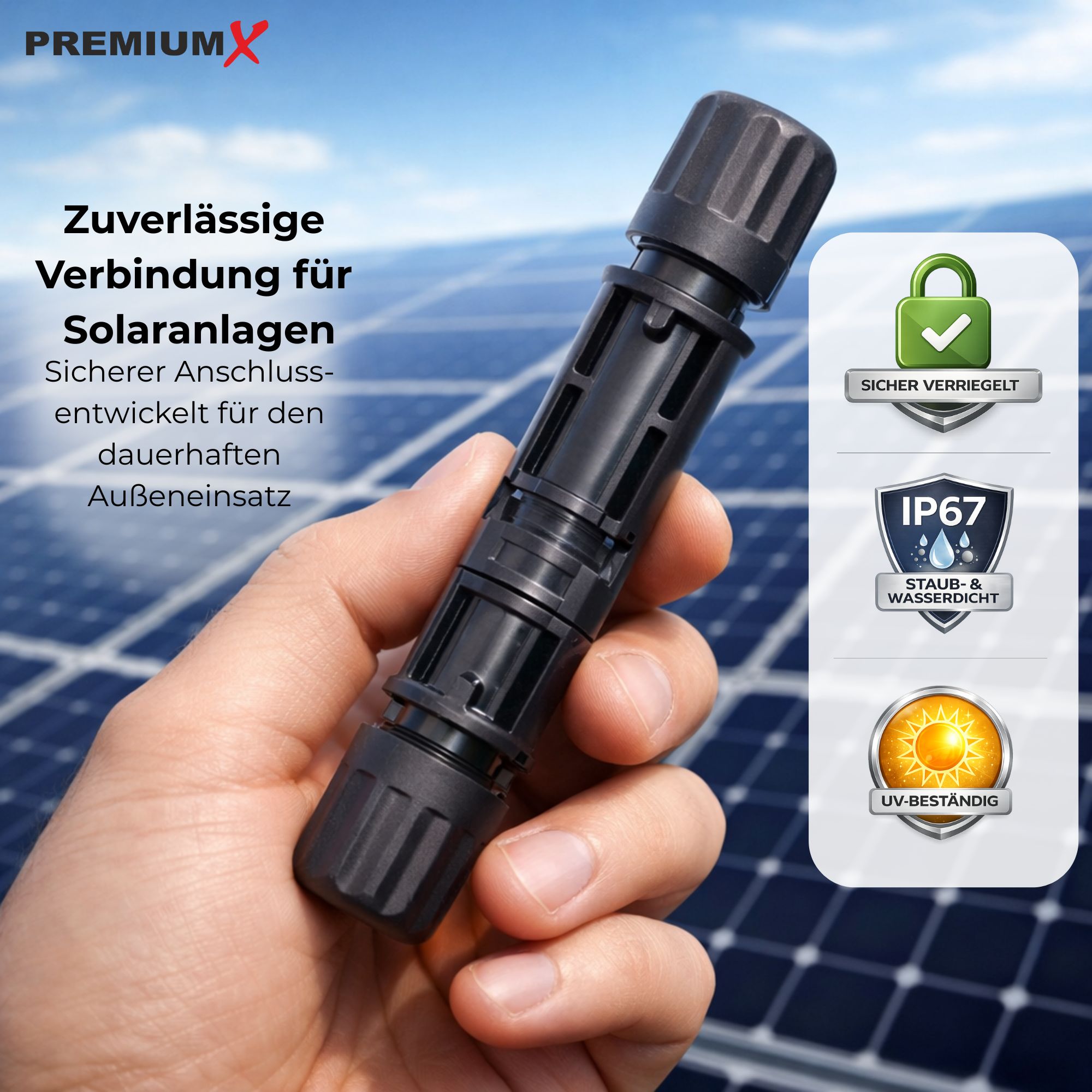 PremiumX 12x Solarkabel-Verbinder – PV-Steckverbinder für Solaranlagen, IP67 wasserdicht, UV-beständig, mechanisch verriegelt