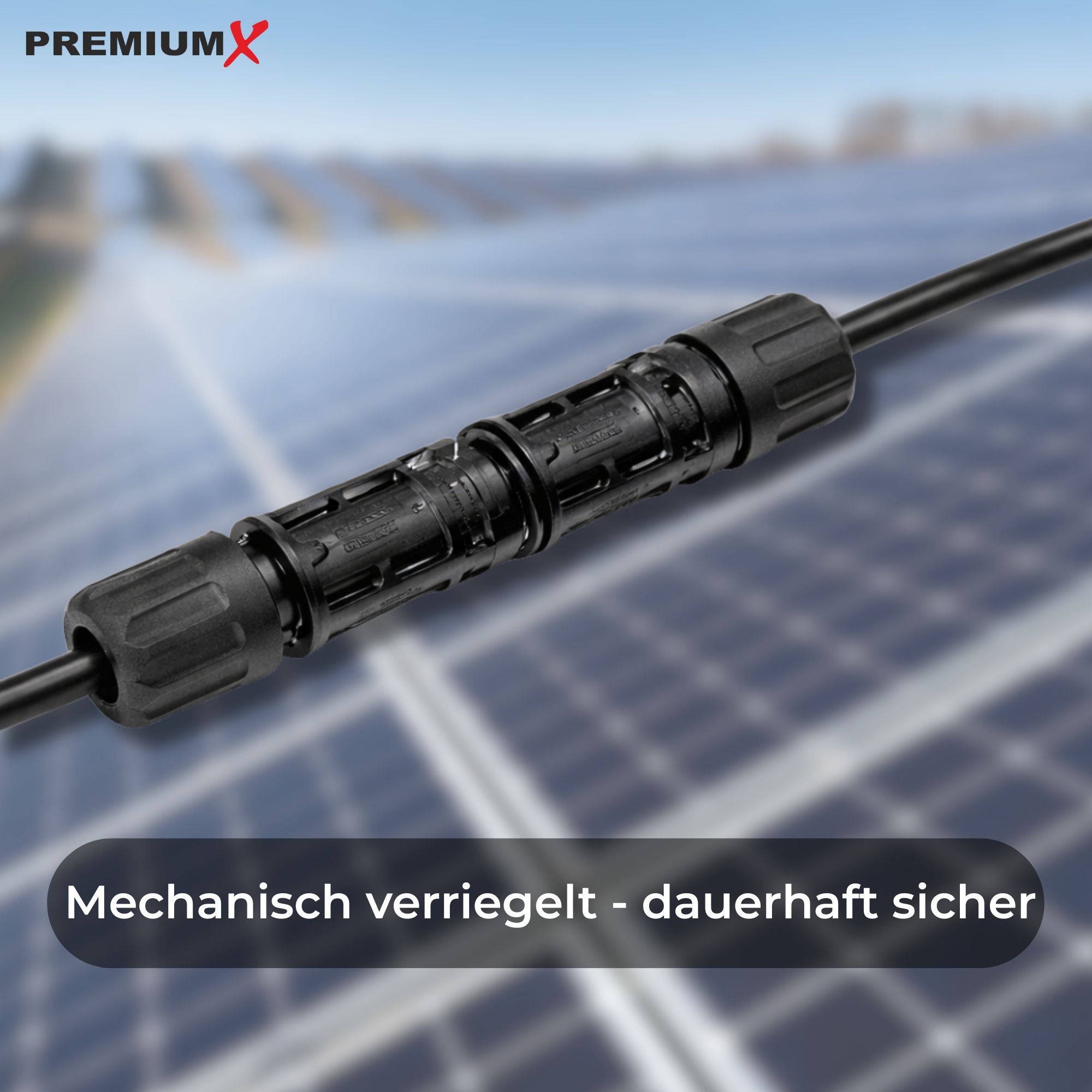 PremiumX Solarstecker stehen für eine robuste, langlebige und sichere Verbindungstechnik im Bereich der Photovoltaik. Entwickelt für Installationen, bei denen Zuverlässigkeit und Witterungsbeständigkeit im Mittelpunkt stehen.