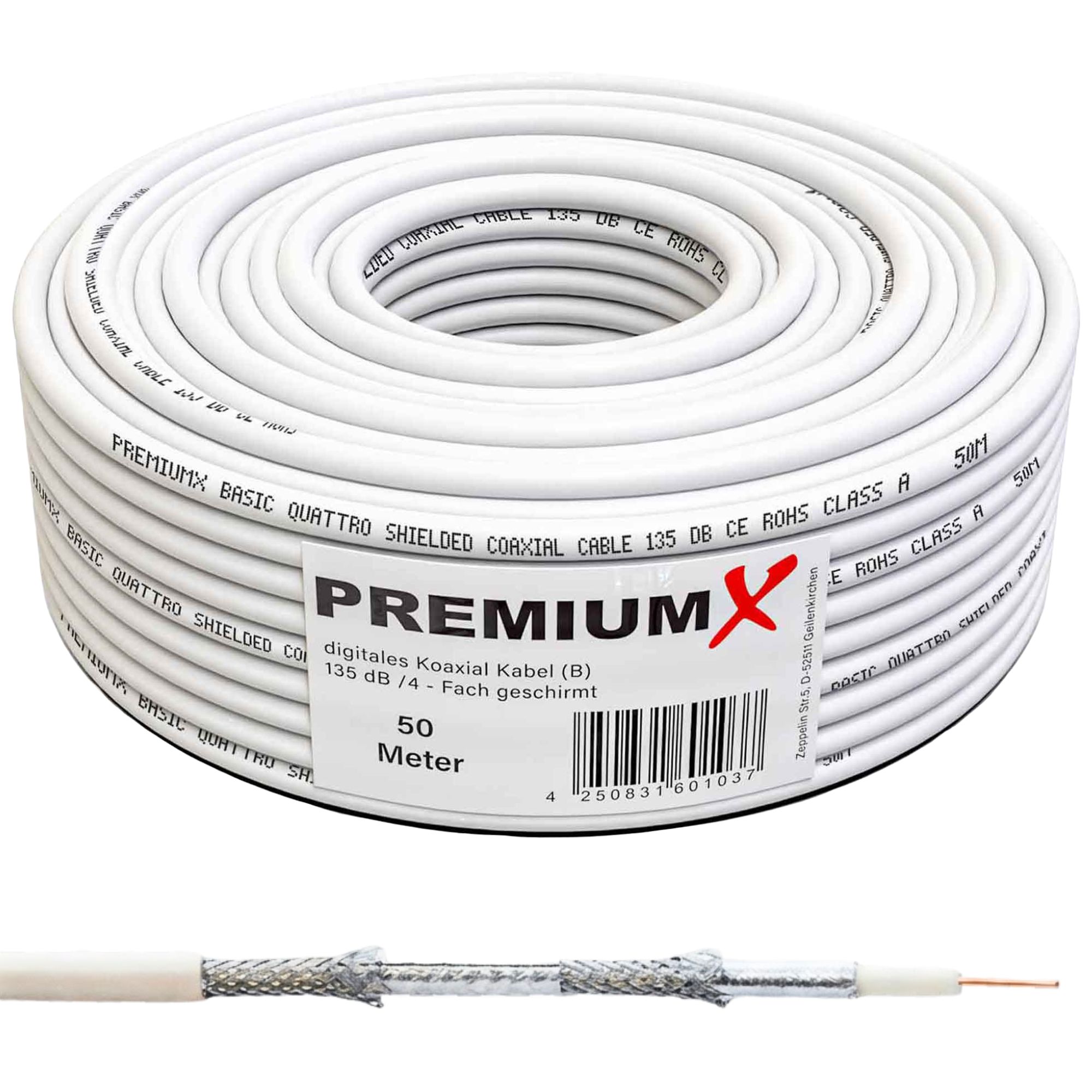 PremiumX 50m BASIC Koaxialkabel 135dB 4-fach CCS SAT Kabel Antennenkabel