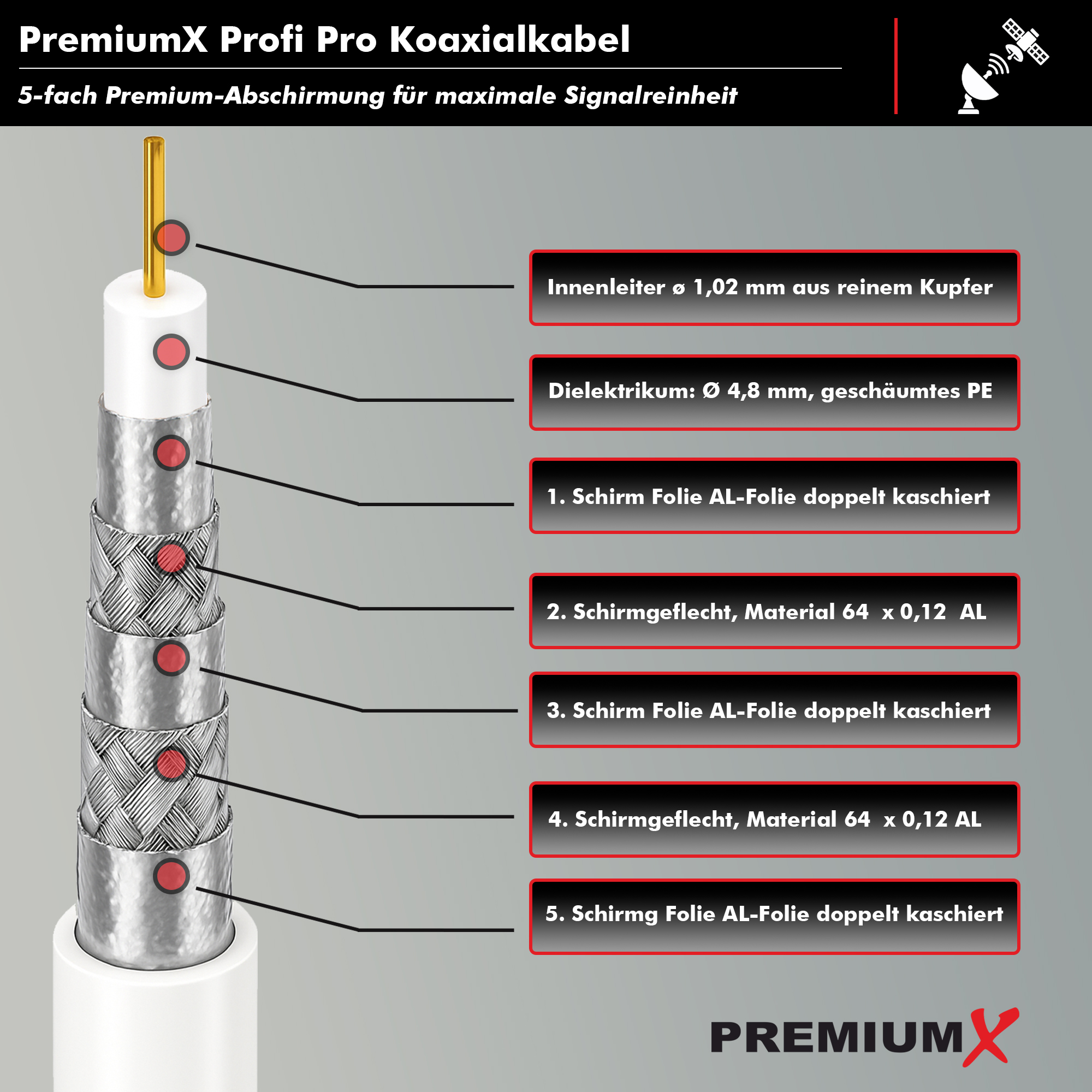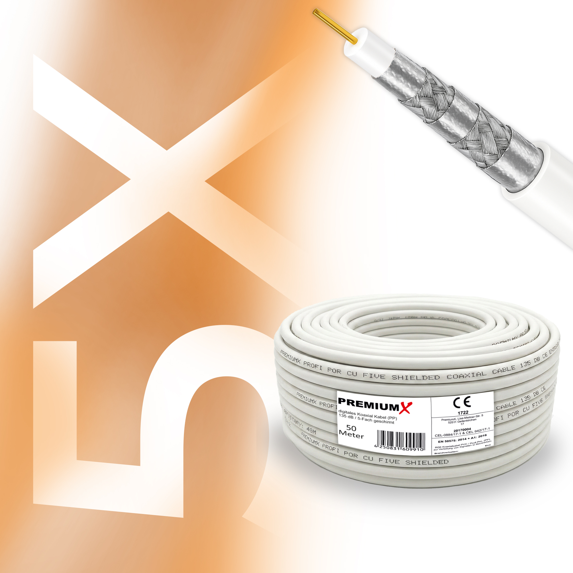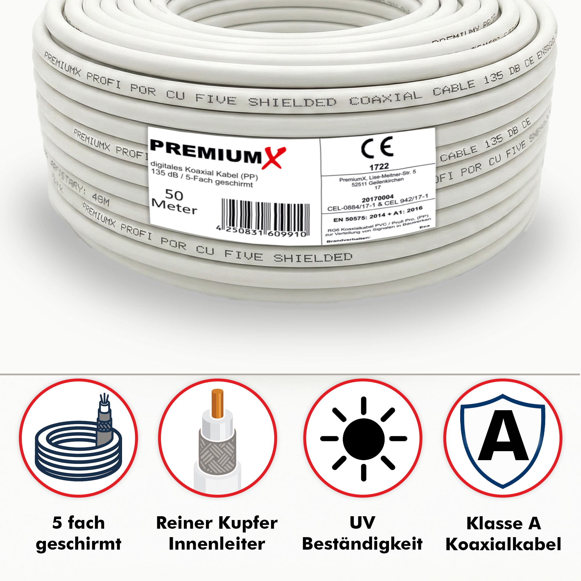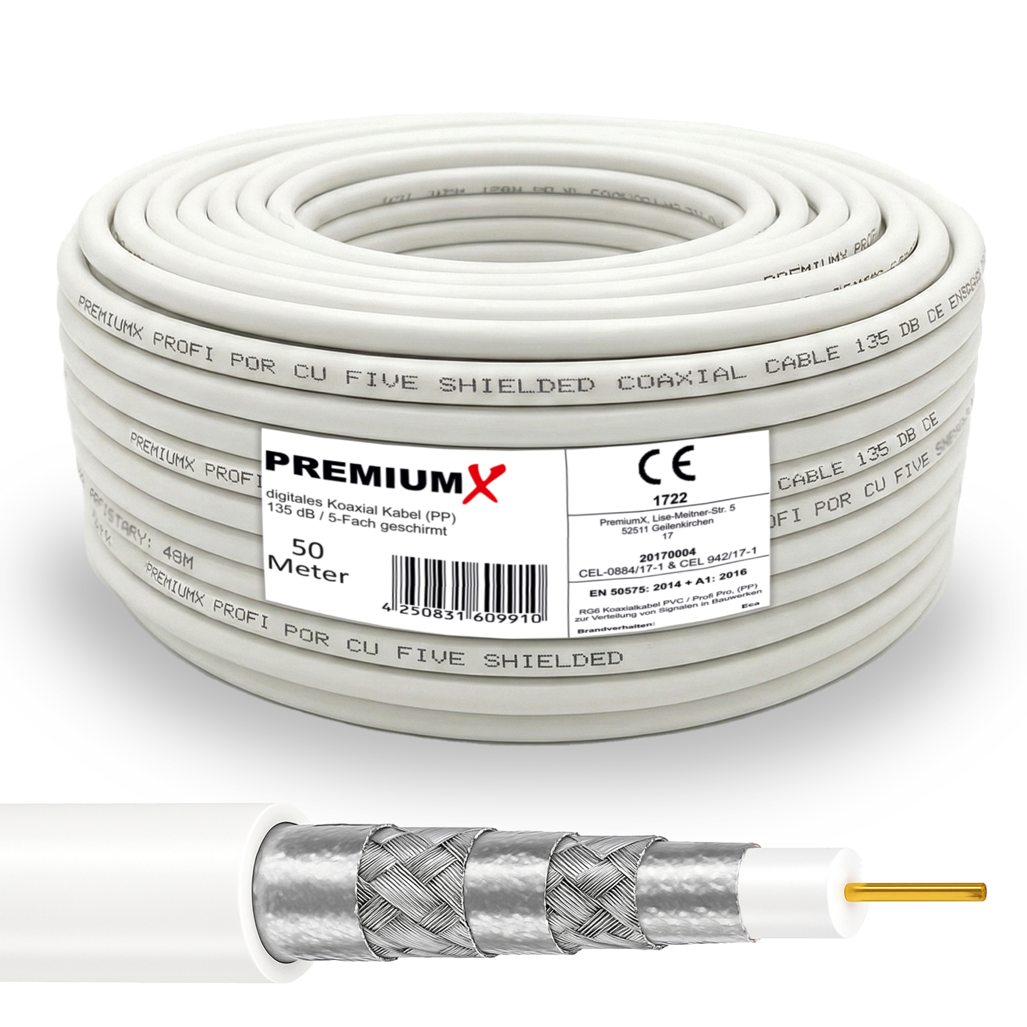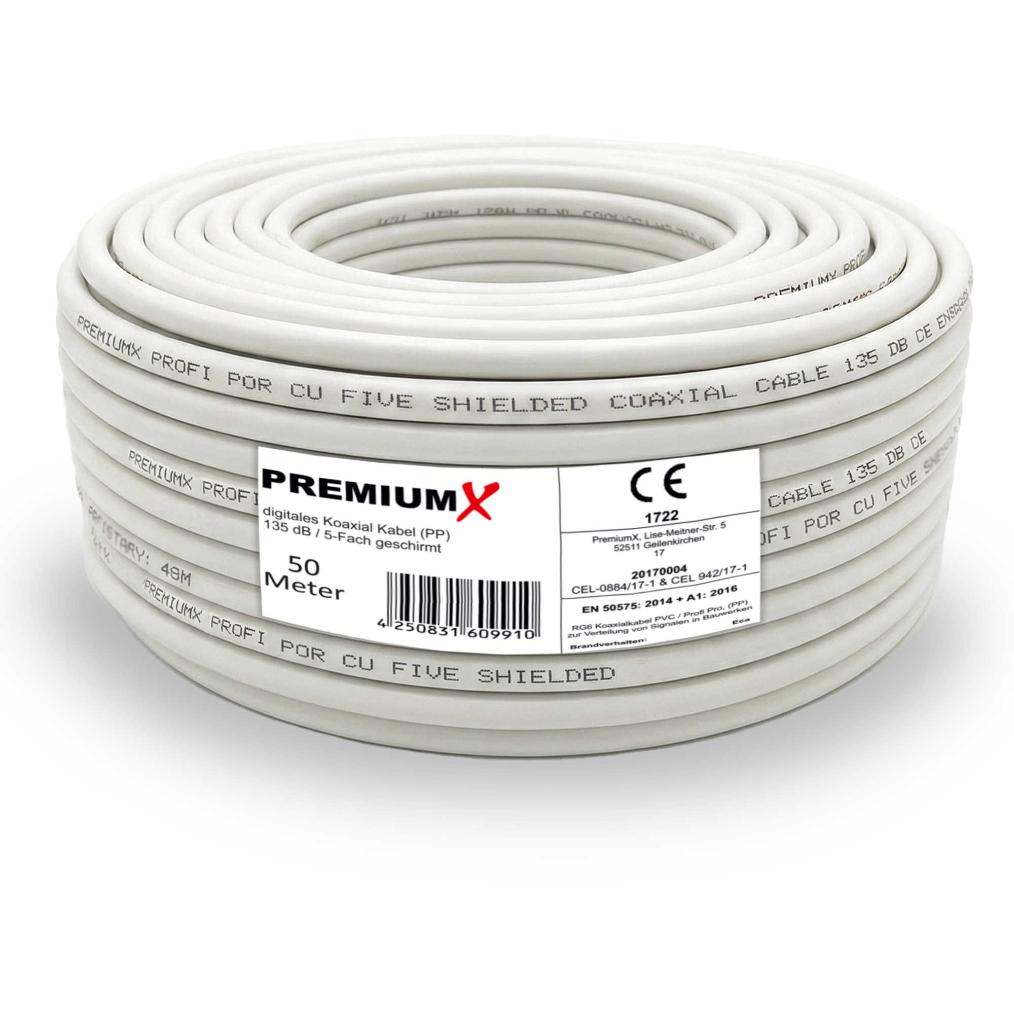 PremiumX 50m PROFI PRO Koaxial Kabel 135dB 5-Fach geschirmt, reines Kupfer SAT Antennenkabel