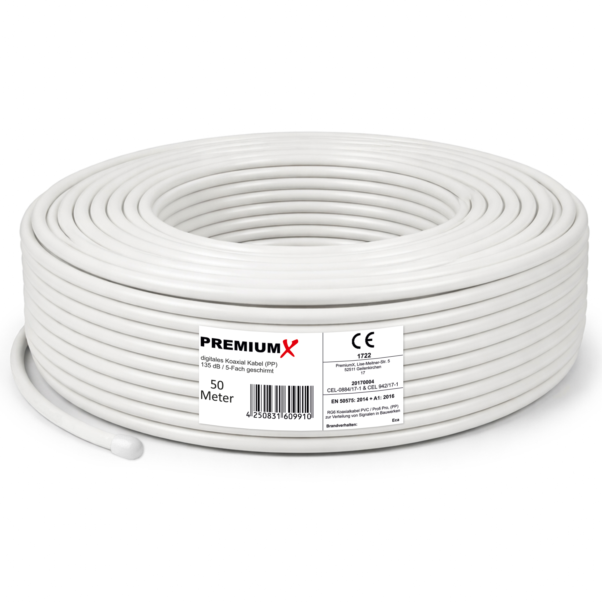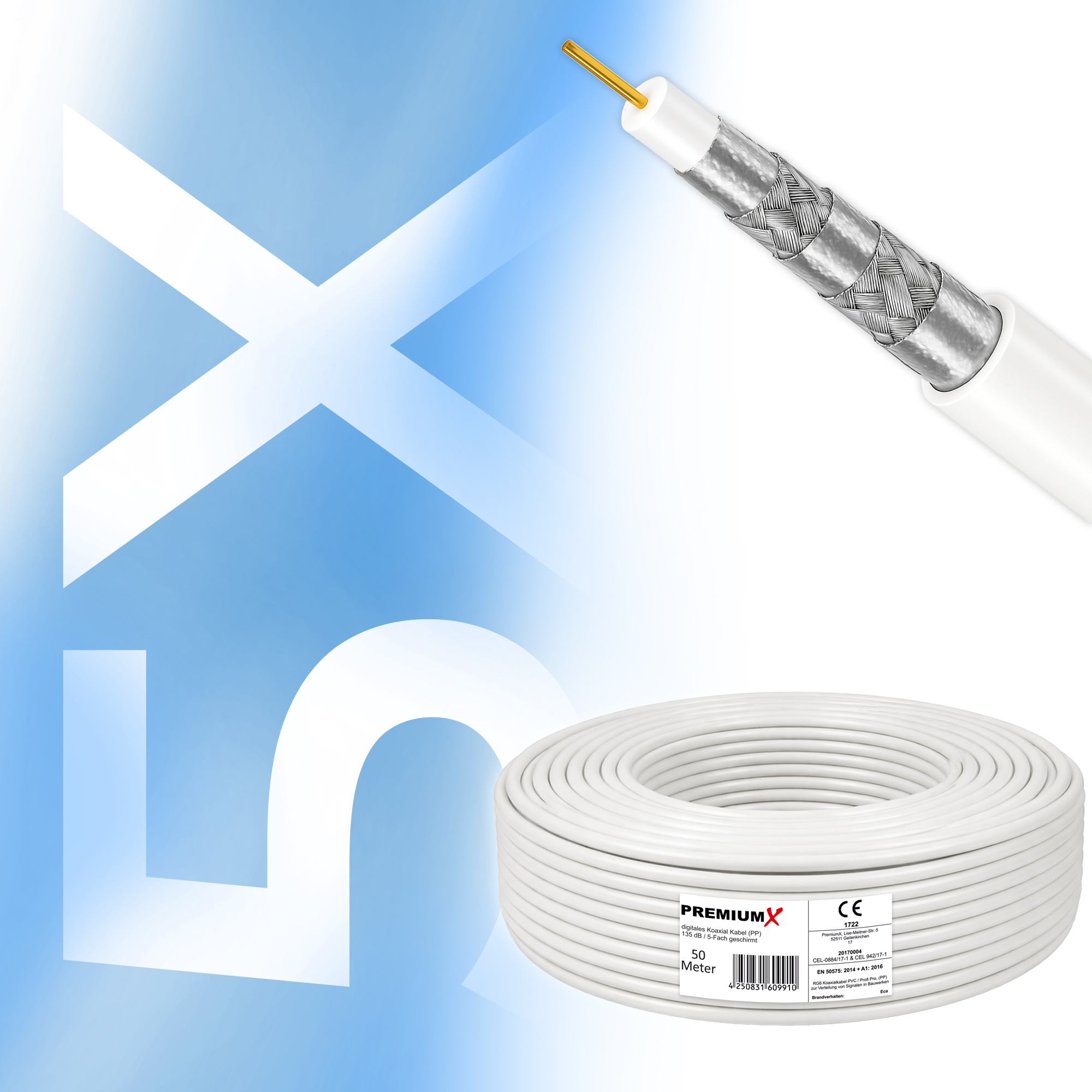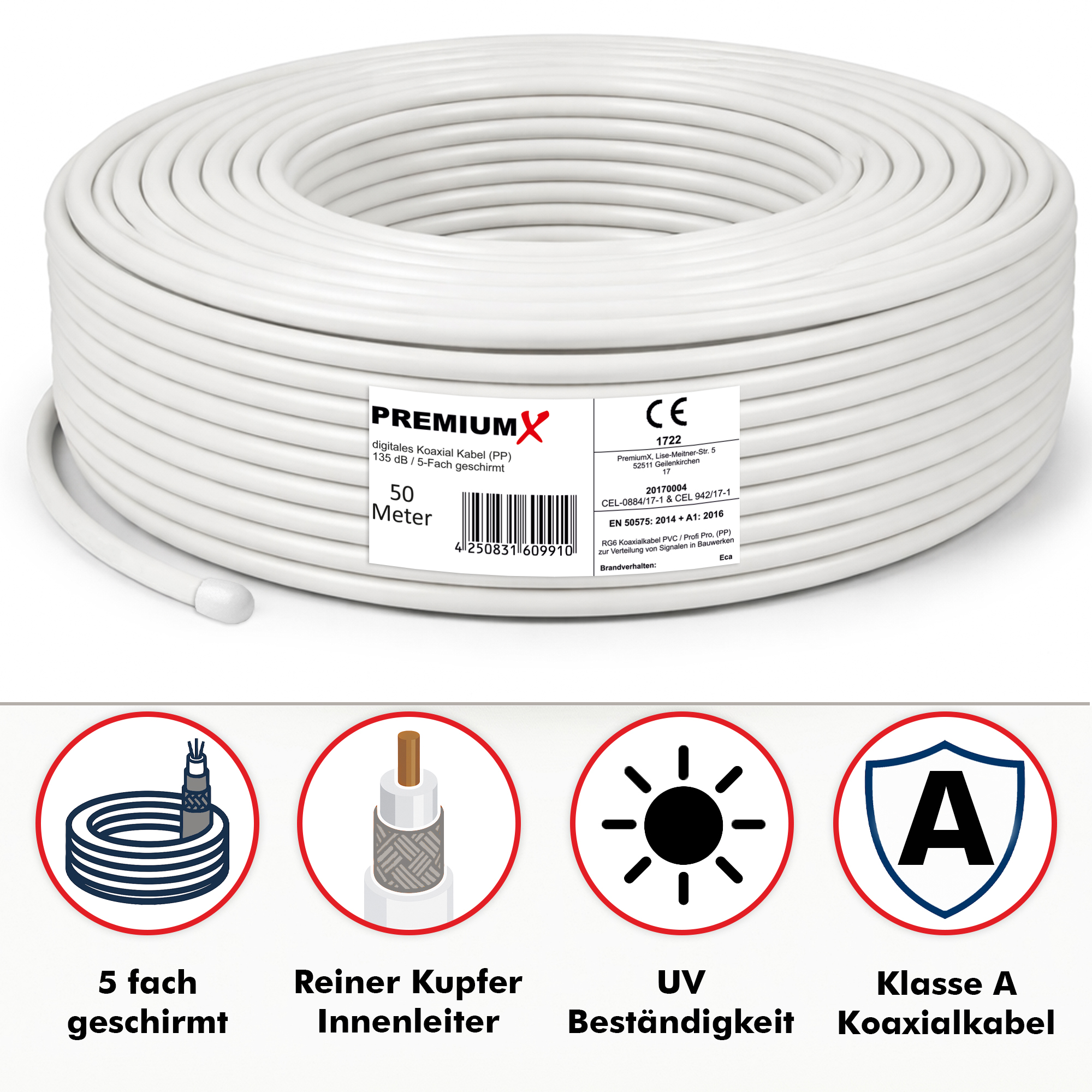 PremiumX 50m PROFI PRO Koaxial Kabel 135dB 5-Fach geschirmt, reines Kupfer SAT Antennenkabel