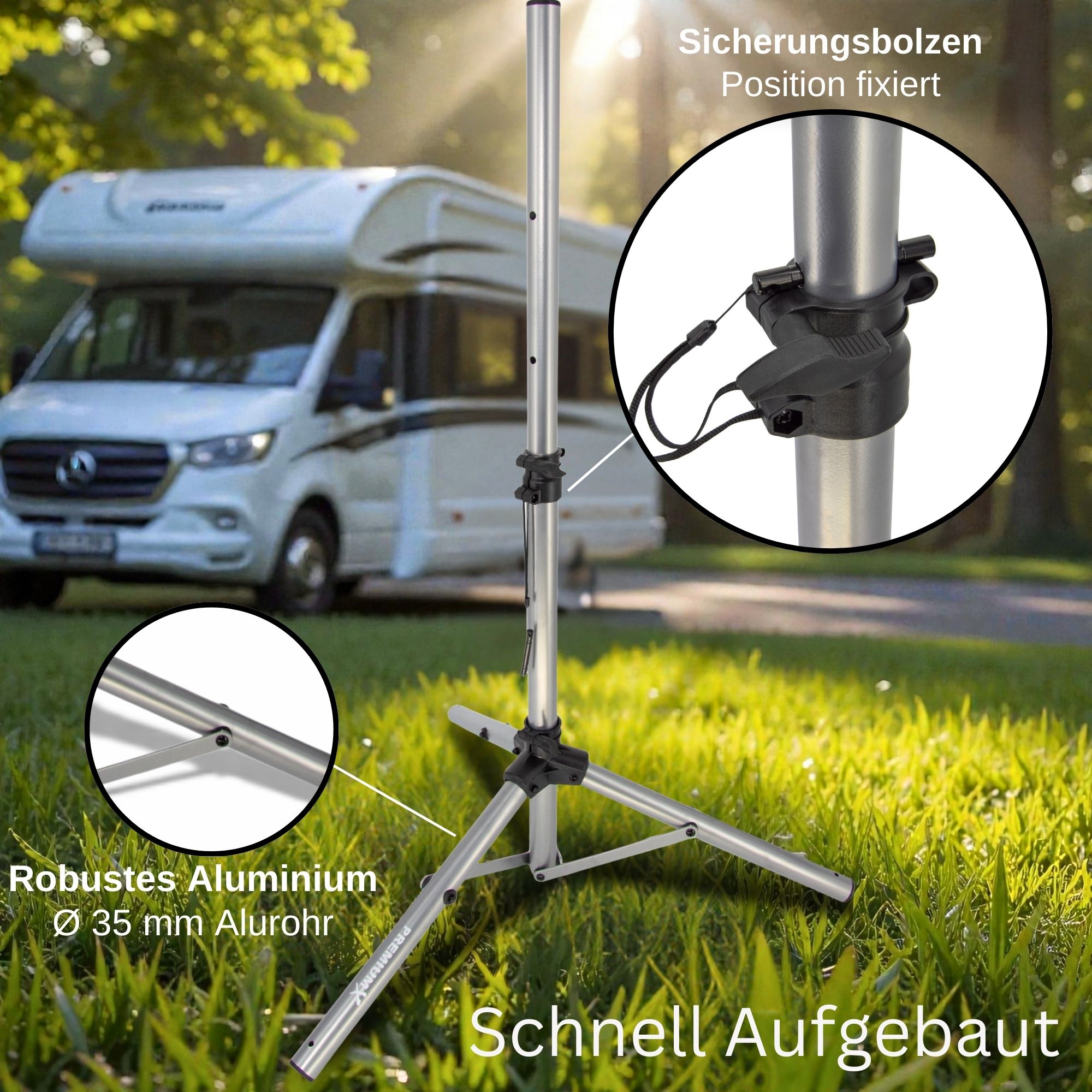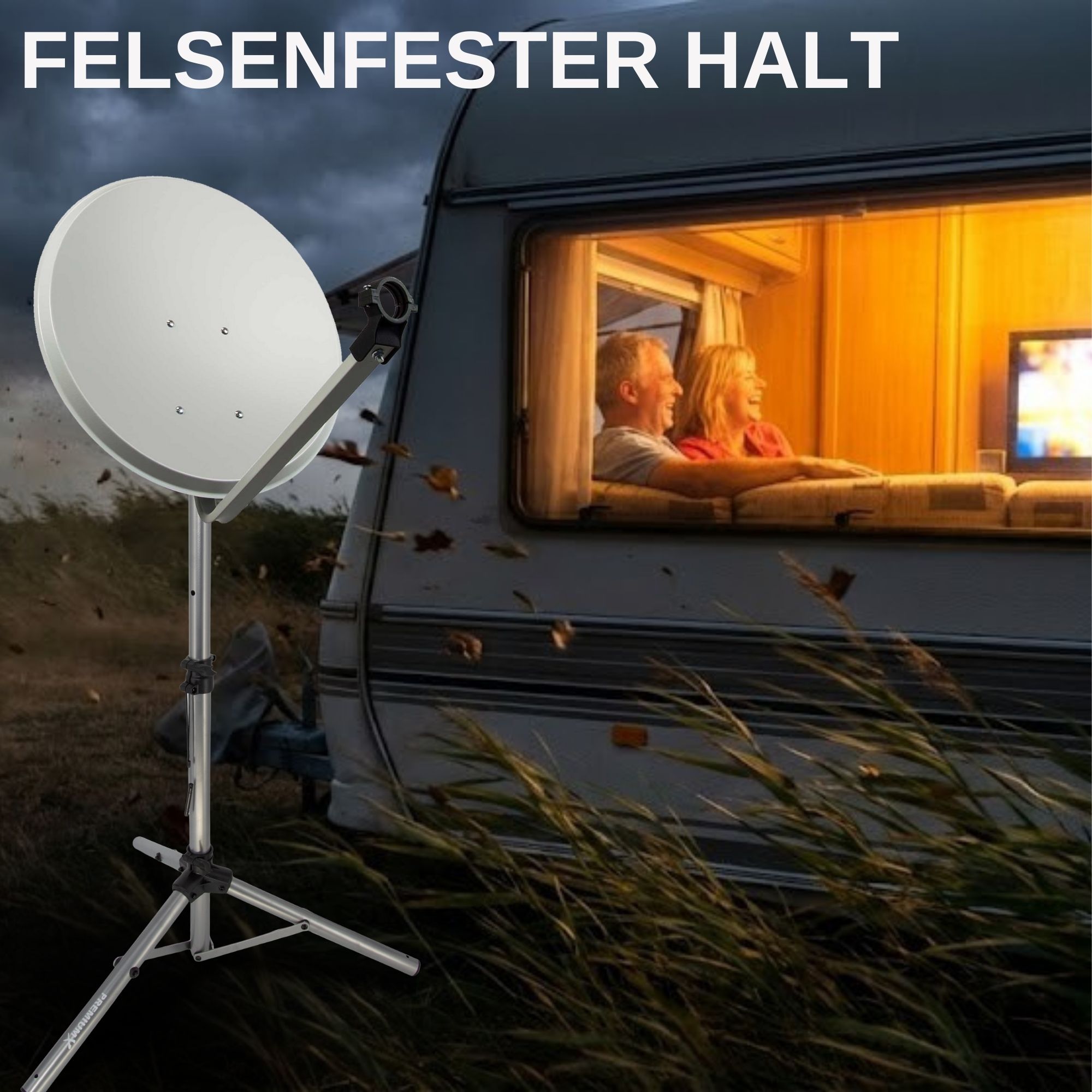 Schnappen Sie sich das PremiumX Dreibein und legen Sie los. Die Montage ist kinderleicht: Einfach aufklappen, mit den Alu-Heringen fixieren und loslegen. Das neue Modell ist dank Teleskopstange bis auf 120 cm höhenverstellbar und bietet Sat-Antennen bis 85 cm einen sicheren Halt. Kompakt zusammenklappbar und extrem stabil – das Must-have für jeden Camping-Fan!