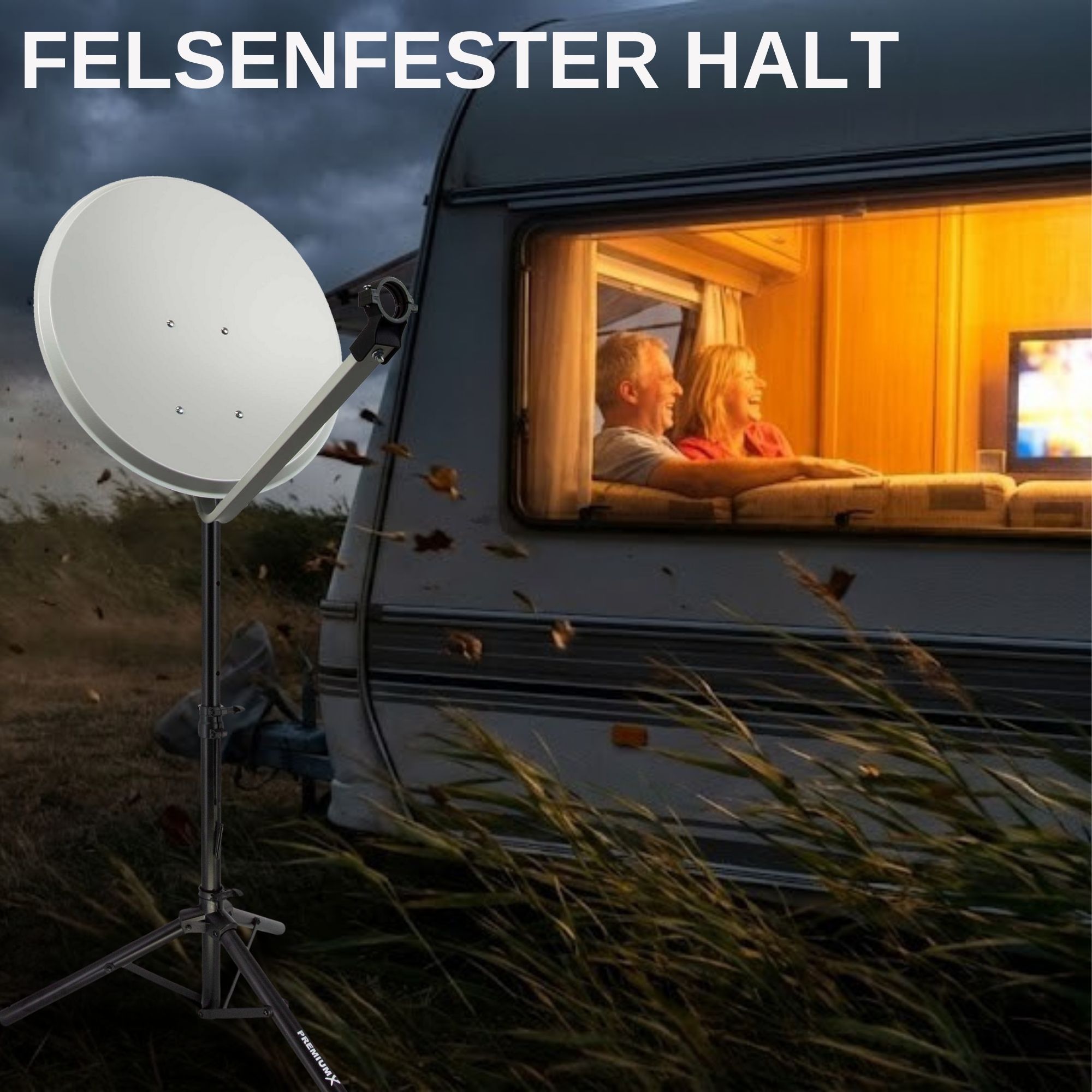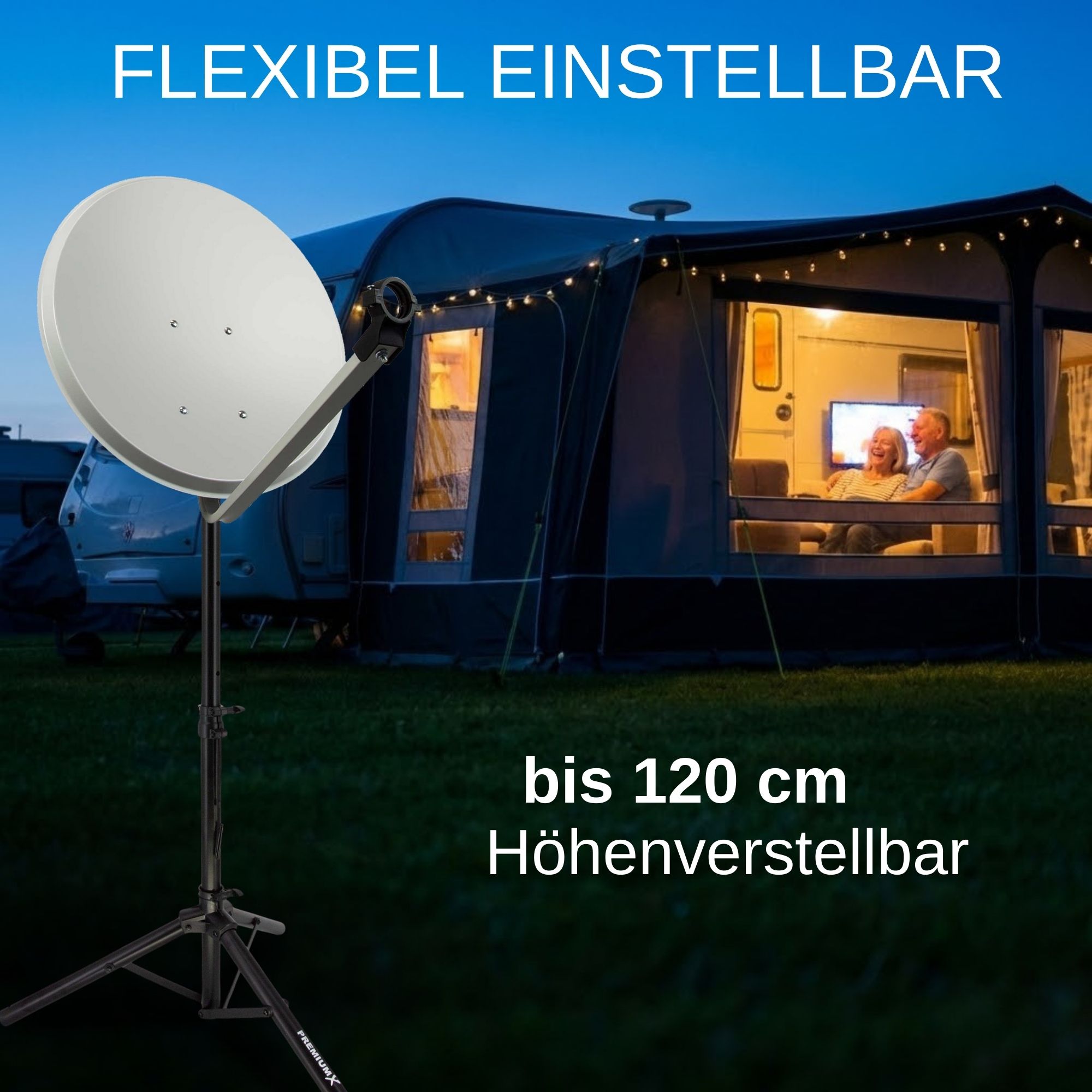 Schnappen Sie sich das PremiumX Dreibein und legen Sie los. Die Montage ist kinderleicht: Einfach aufklappen, mit den Alu-Heringen fixieren und loslegen. Das neue Modell ist dank Teleskopstange bis auf 120 cm höhenverstellbar und bietet Sat-Antennen bis 85 cm einen sicheren Halt. Kompakt zusammenklappbar und extrem stabil – das Must-have für jeden Camping-Fan!