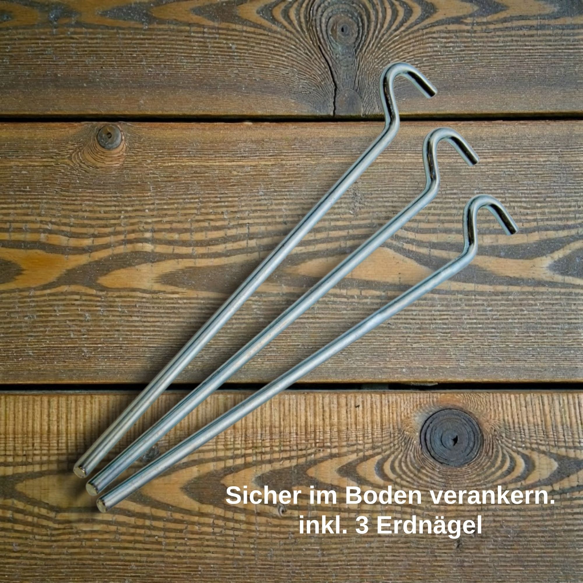 Sicherer Stand: Die drei mitgelieferten Aluminium-Heringe garantieren äußerst hohe Stabilität beim Camping.