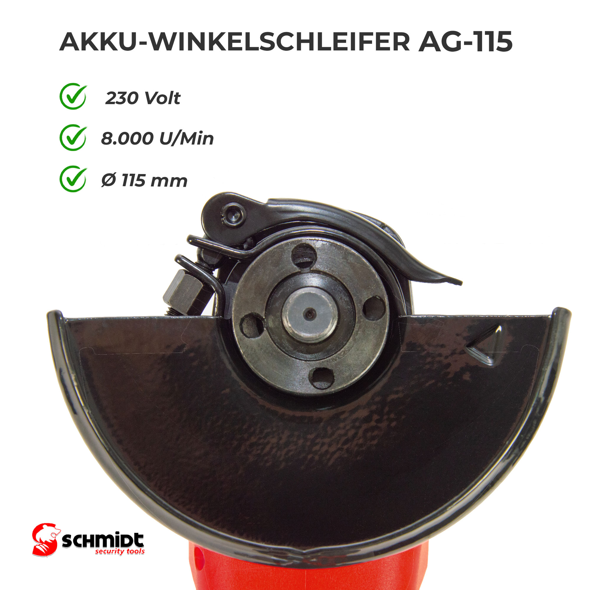 SCHMIDT Security Tools präsentiert den Akkuwinkelschleifer AG-115, inklusive Akku und Ladegerät:
