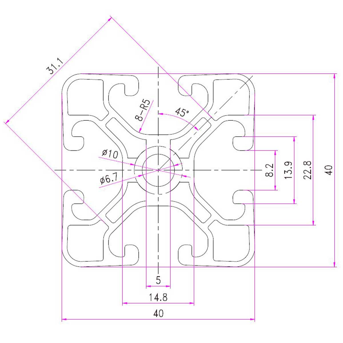 Leichtes Alu Strebenprofil 4040 eloxiert mit 8 mm Nutbreite